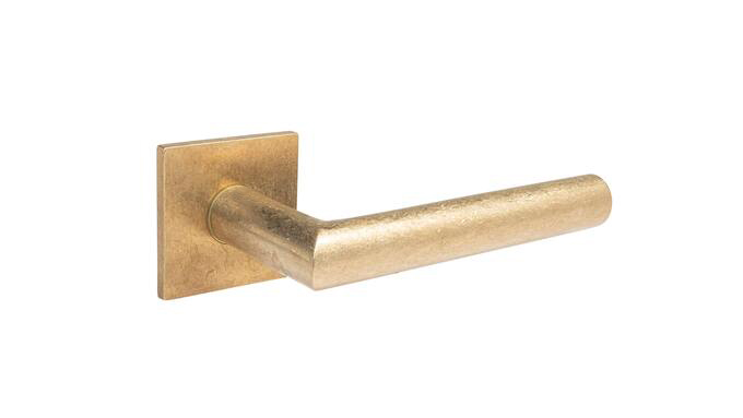 Die Türklinke ist aus massivem Messing gegossen. Die Oberfläche ist anschließend getrommelt und greift in ihrer changierenden Gestalt die Mikostruktur des Messings in für das Auge sichtbarer Weise auf. Wir verwenden bei dem hier gezeigten Griff ausschließlich Komponenten deutschen oder europäischen Ursprungs.